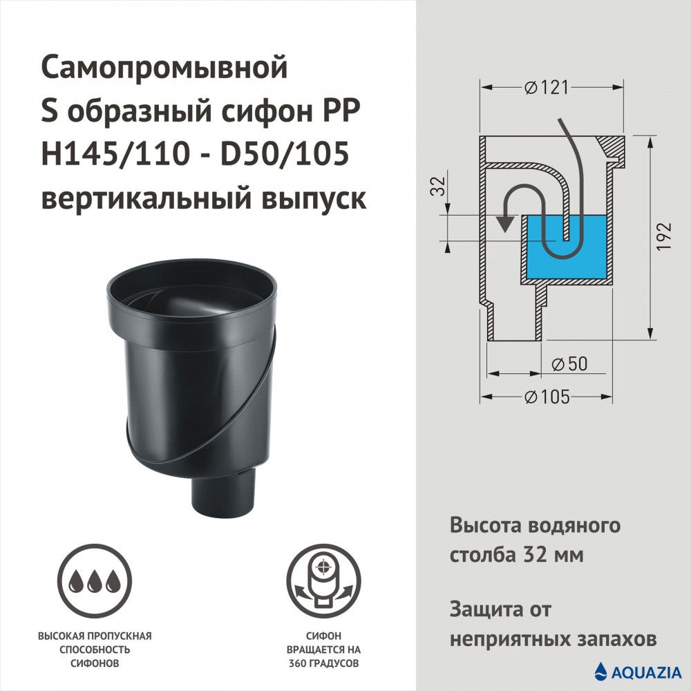 Горизонтальный выпуск D50 H60, пропускная способность 42л/мин, монтаж 360°